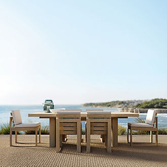 Prefer your patio furniture to have a natural look? Consider a set of unfinished patio furniture made of weather-resistant teak wood. Then, allow it to weather naturally to a mild grey, or add a teak protector to maintain the wood's warm tone. A set featuring a sofa, chairs and a dining table coordinates on the deck or beneath a pergola. Look for Sunbrella cushions in the same bright hue or pattern for a uniform feel. Or, shop individual pieces for your balcony, front steps or lanai. If you're a frequent warm-weather host, consider outdoor kitchen furniture like a combination bar and workstation or a table drop leaf table for extra surface area. Ottomans also provide for versatile use—acting alternatively as foot rests or additional seating. Complete your outdoor entertaining space with melamine dinnerware, outdoor lighting and planters to showcase fresh blooms.