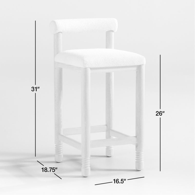 Inspired by a vintage Spanish design, our Revival counter stool brings clean lines and comfort to kitchen-island and high-table dining. Made of solid oak with a light ceruse finish, the stool stands tall on tubular legs accented just above the feet with linear ring carving. A plushly padded seat and cushioned bolster back are covered with an ivory bouclé fabric that keeps the look warm and approachable with just the right amount of textural contrast.