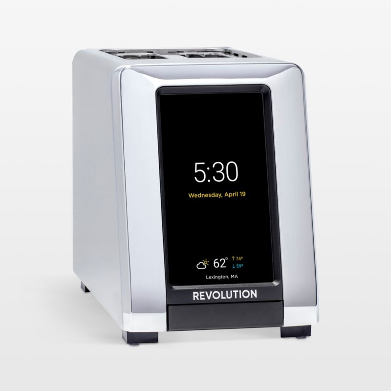 Toast to the future. With its ultra-fast warmup speed and unique diamond-shaped heating elements, this revolutionary toaster browns your bread slices and bagels in no time. Conveniently displayed on a large color monitor, seven browning levels are yours for the choosing along with the ability to set your customized preferences to achieve the perfect golden brown on your waffles, toaster pastries, bread, bagels and English muffins. When not in use, the sleek brushed stainless steel toaster displays the time or local weather—thanks to its Wi-Fi connectivity—to help keep your mornings on track.