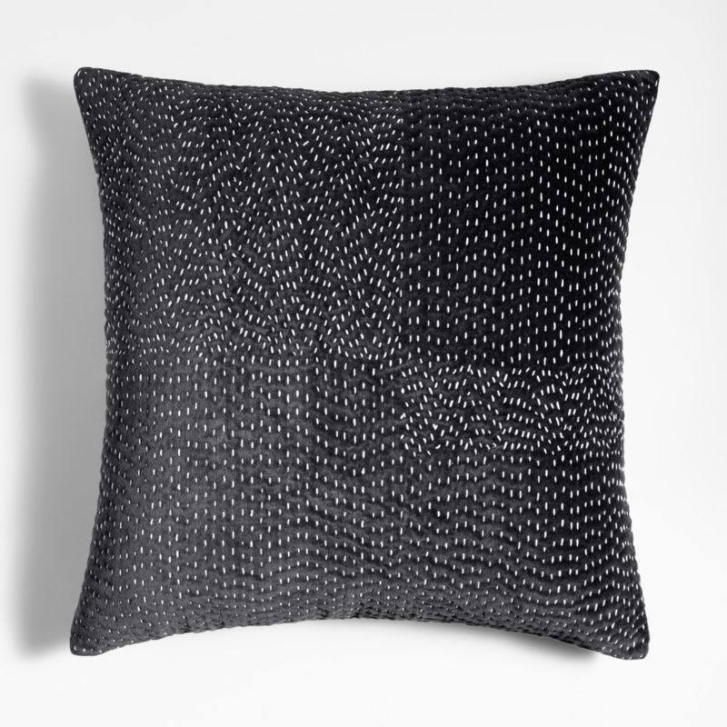 Sashiko—Japanese for "little stabs"—evolved from a practical way to mend and reinforce fabric into an art form in its own right. Inspired by this useful and lovely technique, our pillow cover embellishes dark grey velvet with dainty multidirectional ivory stitches. Skilled artisans embroider the organic cotton velvet by hand for a perfectly imperfect look that's at once timeless and modern. We especially love this luxurious and textural pillow cover tossed on a sofa with others in the same stormy hue. Fill the square pillow cover with a plush feather-down or lofty down-alternative insert (sold separately).