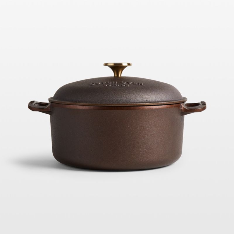 This gorgeous Dutch oven stuns on the stove and table thanks to its copper-hued seasoning, gleaming polished interior and gold-finished knob engraved with Smithey's signature quail. Inspired by vintage cookware, the deep pot is ideal for frying apple fritters or chicken. Top with the lid to roast brisket, slow-cook pot roast or bake cinnamon rolls. The naturally non-stick seasoning ensures easy cleanup, whether you're cooking on the stove, on the grill or over a campfire. Designed to become an heirloom, the Dutch oven improves with daily use and will blacken to a classic cast iron patina with use.