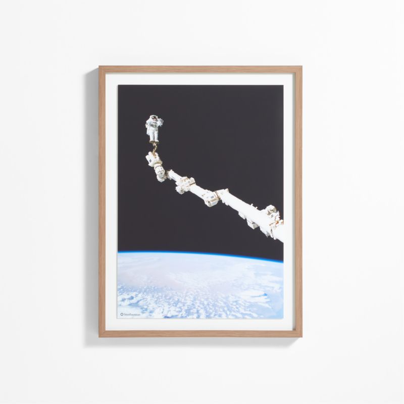 Striking artwork for kid spaces? Mission possible! This framed giclée photo shows the dramatic moment when repairs were done to a space shuttle in orbit for the first time. The brave astronaut, surrounded by dark space and the bright Earth below, is anchored to the International Space Station by only a foot restraint.