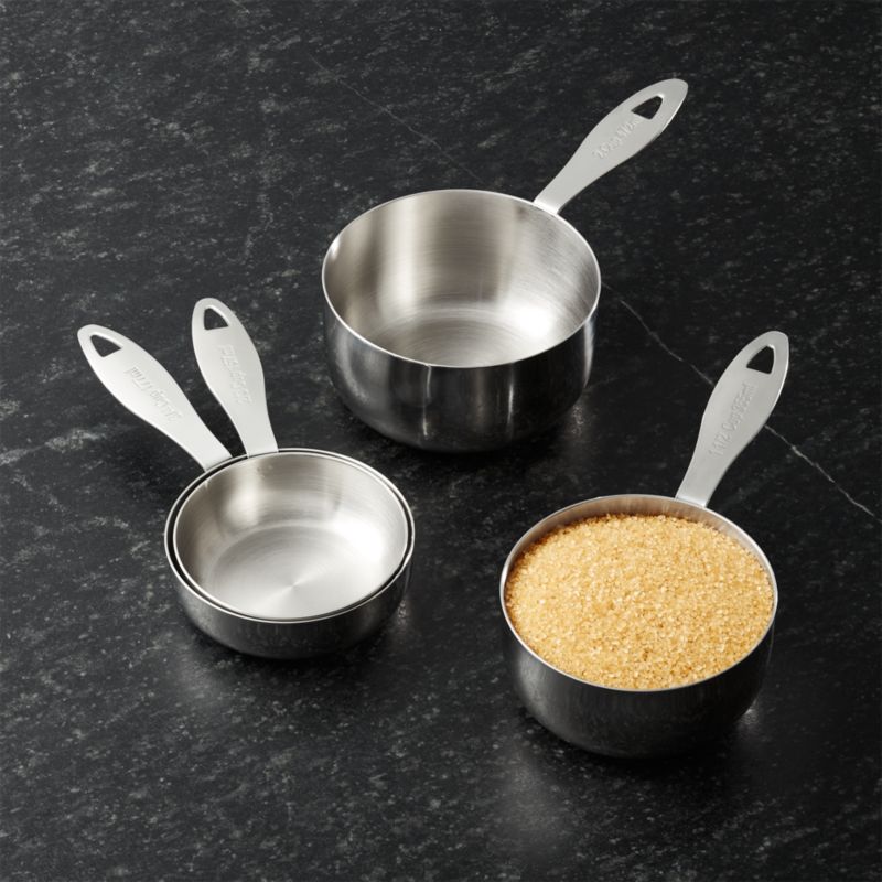 Take the guesswork out of odd-size ingredient portions with this stainless steel set that measures in 2/3-, 3/4-, 1 1/2- and 2-cup measurements. The substantial stainless steel measuring cups have a wide profile for easy measuring and flat bases that sit steady on the counter.