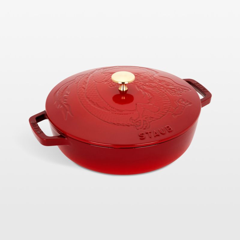 Cook, bake and serve a Lunar New Year feast in this heirloom-quality saute pan that goes effortlessly from stove to oven to table. Embossed with a dramatic dragon swirling around the brass knob, the lid adds a festive note to the cast iron pot enamelled in cherry red. The pan cooks evenly and efficiently thanks to its heat-retaining material, and the fiery glaze resists chipping and cracking. Staub's signature matte black interior excels at braising, roasting and caramelizing and is scratch resistant and easy to clean. To ensure moist and flavorful results, the spiked lid is designed to create a rain-forest effect that returns juices back on the food, providing continuous, natural basting. This saute pan makes a fabulous gift or a stunning centerpiece to holiday meals.