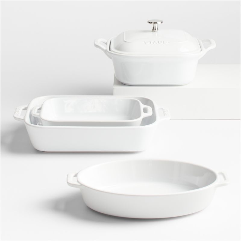 Staub bakes breakfast, dinner and dessert with this set of five stoneware baking dishes. Glazed white with a porcelain enamel finish, the bakers prevent the absorption of moisture. Enjoy cinnamon rolls, sausage strata, spinach lasagna, garlicky potato torte, and moist brownies every time. The pans resist impact and thermal shock to go straight from freezer to oven to table.