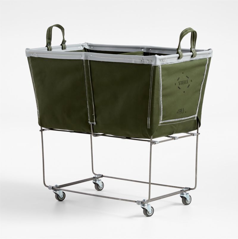 Transform the laundry room into a place of organization and efficiency. This industrial-style divided canvas truck sorts whites from darks or cottons from delicates in a spacious partitioned bin at an ergonomic height to reduce bending over. Manufactured by the Steele Canvas Basket Co., the sturdy steel frame is wrapped in dark olive green pure cotton canvas with a rubber edge. Designed with the authentic quality and style of a professional launderer's truck, its generous 200-pound capacity can handle up to four bushels of heavy laundry, gliding with ease on rubber casters. Imprinted with the mark of heritage, the Steele logo is hand-applied using the original brass stencil from almost a century ago when the company began producing commercial-grade canvas products.