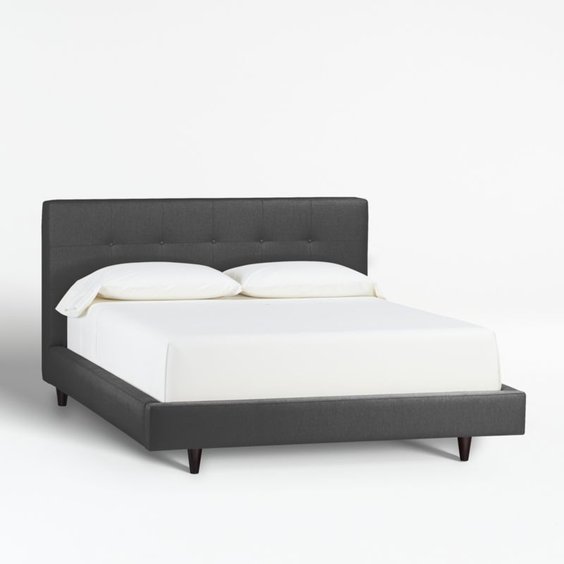 Our 1960s-inspired Tate collection recalls the timelessness of mid-century design with tailored profiles and streamlined shapes. The bed's textural fabric is punctuated with retro button-tufting on the headboard, which is fully upholstered front and back to give you more flexibility in positioning the bed. Streamlined, low platform design takes a minimal stance with dark brown tapered legs.