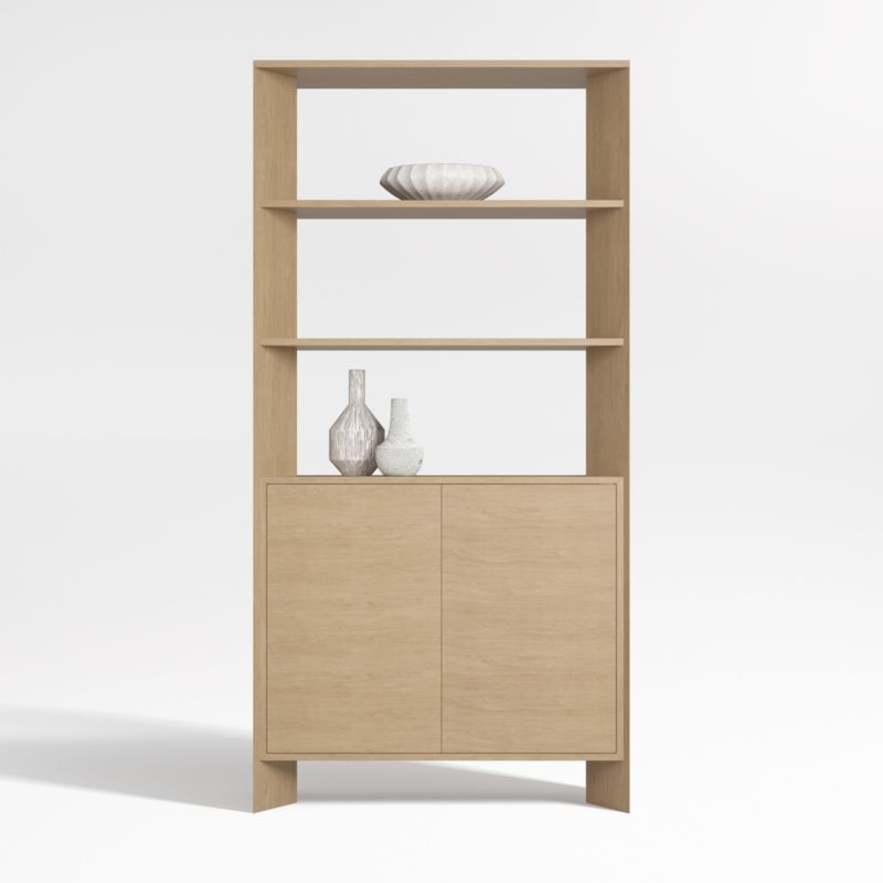 Terrazza transforms household storage with unexpected angles and intersecting shapes. Triangular legs rise straight to the bookcase top, lending a sense of movement to the media console's clean, rectilinear profile. Flat-front, push-to-open doors provide easy access to interior storage. Made of solid oak and oak veneer, the bookcase cabinet is gently wire brushed and given a light ivory ceruse finish to bring out the wood grain.