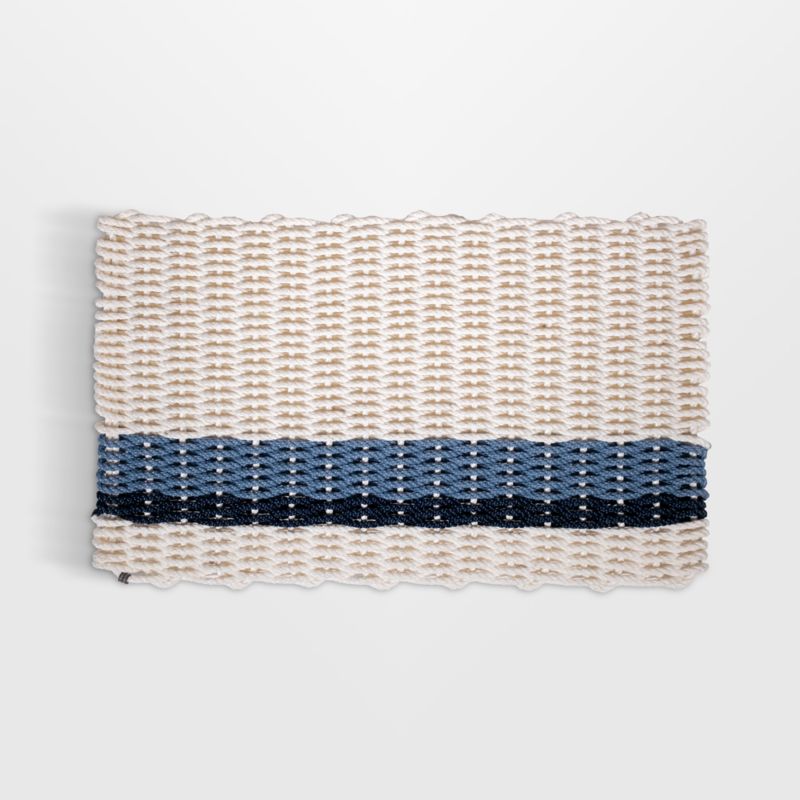 Handwoven out of handmade rope in Maine, this striped doormat weathers all seasons and conditions. The mat brings home the durability of rugged, fishing-grade nautical rope to your front door. Crafted with a chunky basketweave of offset light blue and navy stripes on pearly white, the doormat looks classic and sophisticated yet offers exceptional performance by effectively removing dirt from muddy shoes, repelling water and resisting mold and mildew.