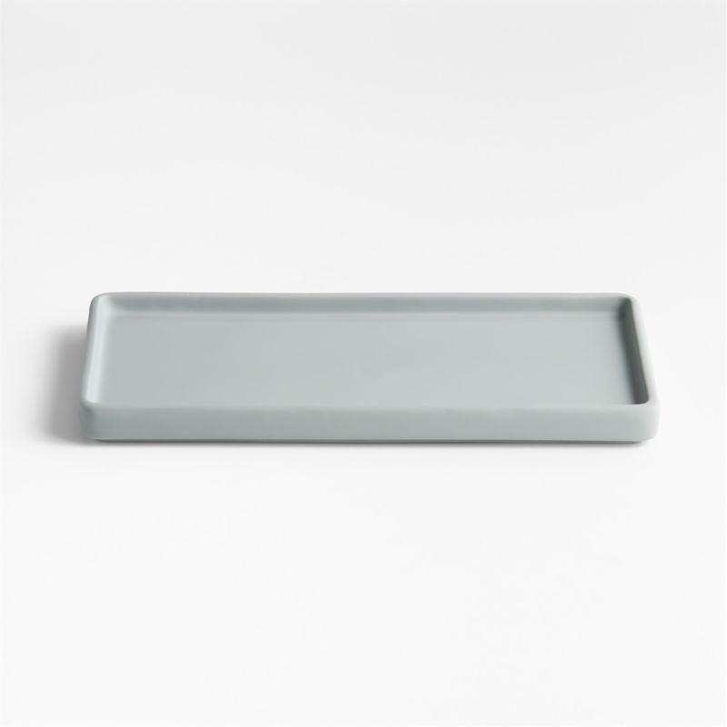 Our Varick bathroom collection dips sturdy ceramic in soft-touch silicone that feels soft and luxurious. The gentle, minimalist curves and compact scale suit even the smallest powder room, guest bath or en suite. Subtly tinted in a modern shade of light grey-blue, this vanity tray corrals scent bottles and jewelry or the matching soap pump, tumbler and canister. Outfit bathrooms in all of our Varick accessories to create serene sanctuaries that are ready for company.