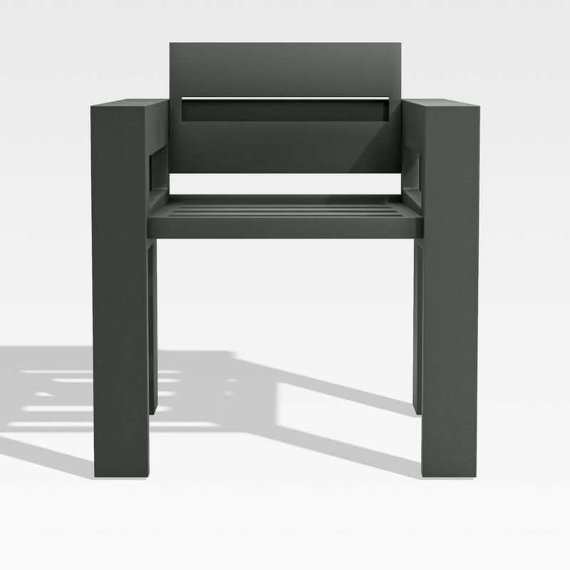 Made for chic alfresco entertaining, the design of our Walker dining chair is based on the recessed detailing and architectural lines of our bestselling Walker outdoor lounge collection. Constructed of durable aluminum with a dark grey finish, the dining chair sets back the frame to bring the plank-style legs and wrap-around back into dimensional focus. The back slants for a comfortable recline. Pair with the coordinating Walker dining table for an inviting and stylish outdoor ensemble. Designed by Blake Tovin of Tovin Design, our Walker aluminum dining chair is a Crate & Barrel exclusive.