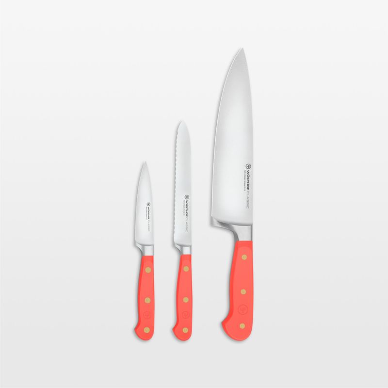The perfect partner to expressive cuisine, this set of peach-handled knives complements your kitchen with beautiful color. Part of Wusthof's Classic series known for its durability and high quality, the 8-inch chef, 5-inch serrated utility and 3.5-inch paring knives form the basis of any cutlery collection. Each knife in the three-piece set is forged from a single piece of high-carbon stainless steel and finished with a long-lasting edge. Brass-riveted handles provide the full-tang knives with a comfortable handhold as well as a dash of coral-inspired color.