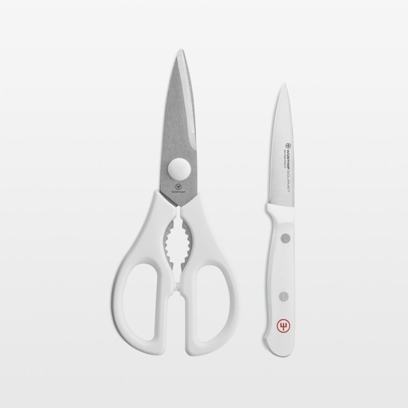 The heritage of Wüsthof, now in an affordable, quality construction. Customize your cutlery collection with these basic Wüsthof building blocks. This two-piece white-handled set pairs an all-purpose high-carbon stainless steel paring knife with kitchen shears that boast a small bottle/jar opener in the handles.