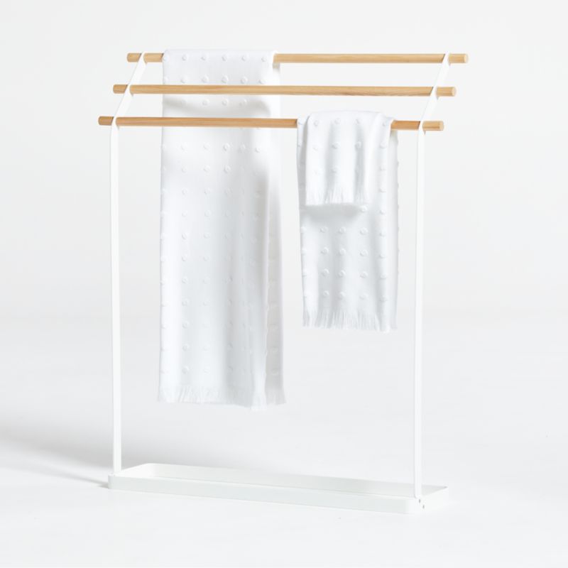 We love this towel rack's minimalist design and fresh mix of materials. Made of white-finished steel, the freestanding rack angles three wooden rods to dry or display towels. Each rod extends beyond the frame to provide even more spots to hang washcloths, bath brushes and more. Designed with a small footprint, the rack makes the most of space in any size bathroom.