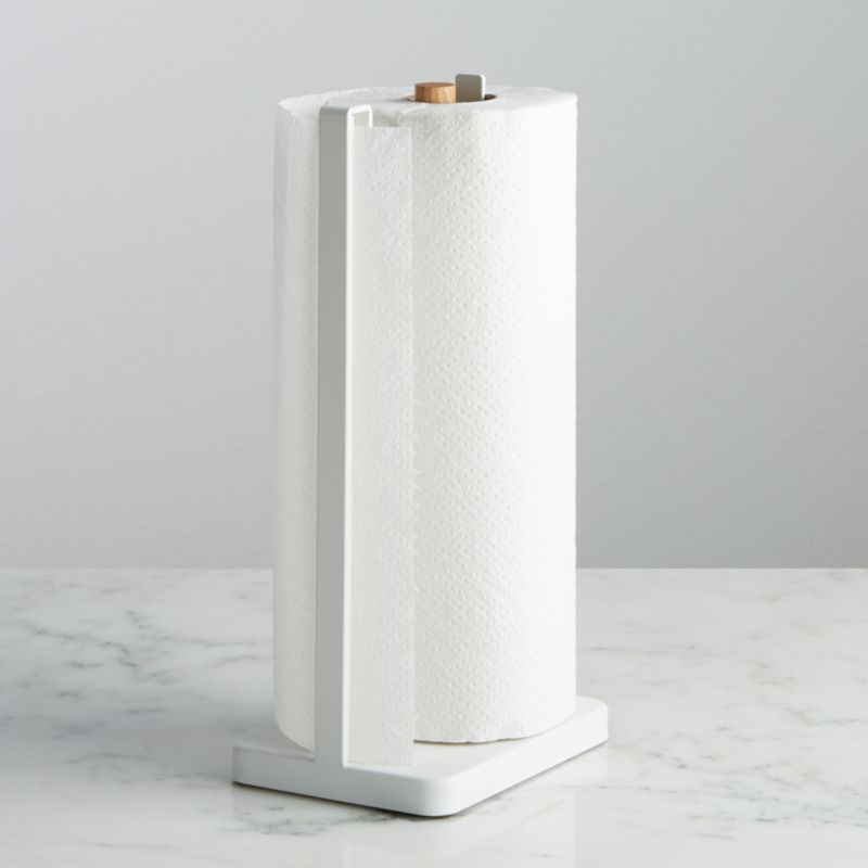 Tear paper towels perfectly with one hand using this minimalist paper towel holder. For easy one-handed ripping—extremely helpful when your hands are wet or full—the upright holder threads paper towels through a geometric frame constructed of sturdy steel and finished in glossy white. The central wooden rod contrasts warmly with the bright white, while another vertical bar prevents the roll from rattling around. Inspired by Scandinavian design, this one-handed-tear paper towel holder graces your countertop with beautifully clean lines.