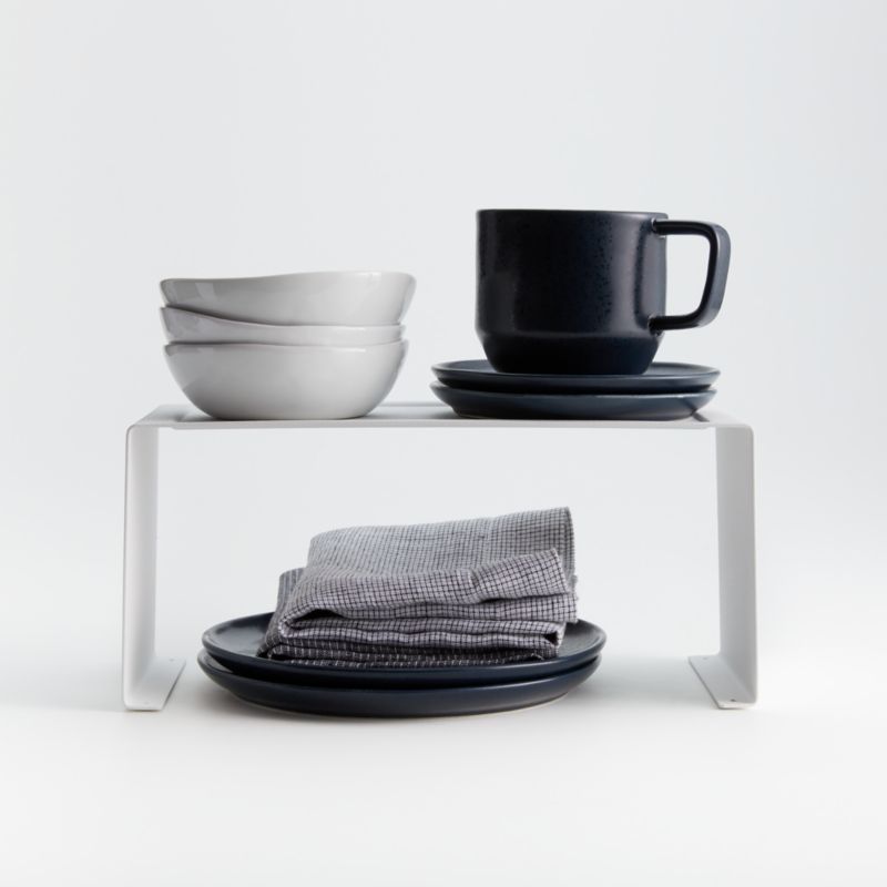 Elevate essentials while increasing storage with this sleek rack. Whether used separately or stacked in multiples, the small kitchen rack provides additional space on countertops, in cabinets or on open shelves. Constructed of sturdy steel with a subtle rim and glossy white finish, this stackable kitchen rack stores spices, coffee accessories or small kitchen essentials.