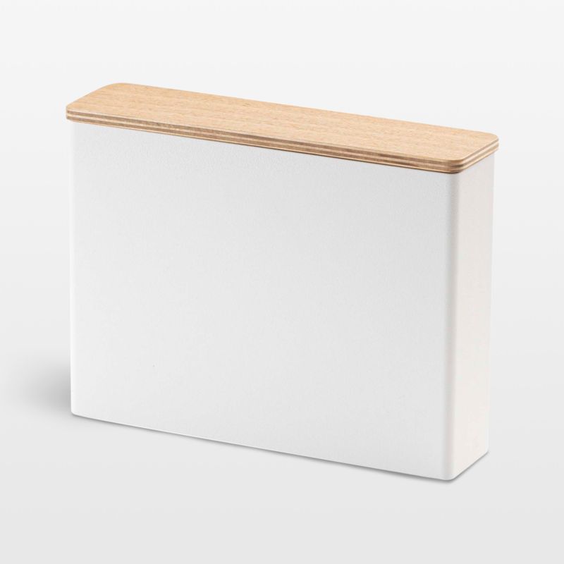 Keep your paper coffee filters crumple-free and stylishly contained with this mixed-material storage case. Made of white-finished steel, the rectangular box holds #4 cone coffee filters and is topped off with an ash wood lid. Enjoy the convenience and clutter-free look of this handsome storage solution on your kitchen countertop or coffee station.