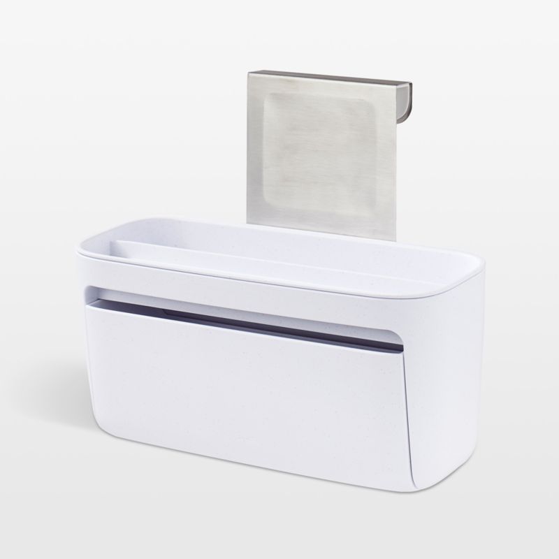This ingenious organizer makes the most of your available storage space, neatly holding dishwashing essentials so they're easy to grab. The speckled white flip-down bin opens smoothly to hold up to 50 dishwasher pods. A removable tray above offers space for sponges, rinse aid and dish soap. Lined with nonslip padding so it stays firmly in place, the handsome steel hook with anti-fingerprint finish fits over your under-sink cabinet door to keep dishwashing supplies orderly and accessible.